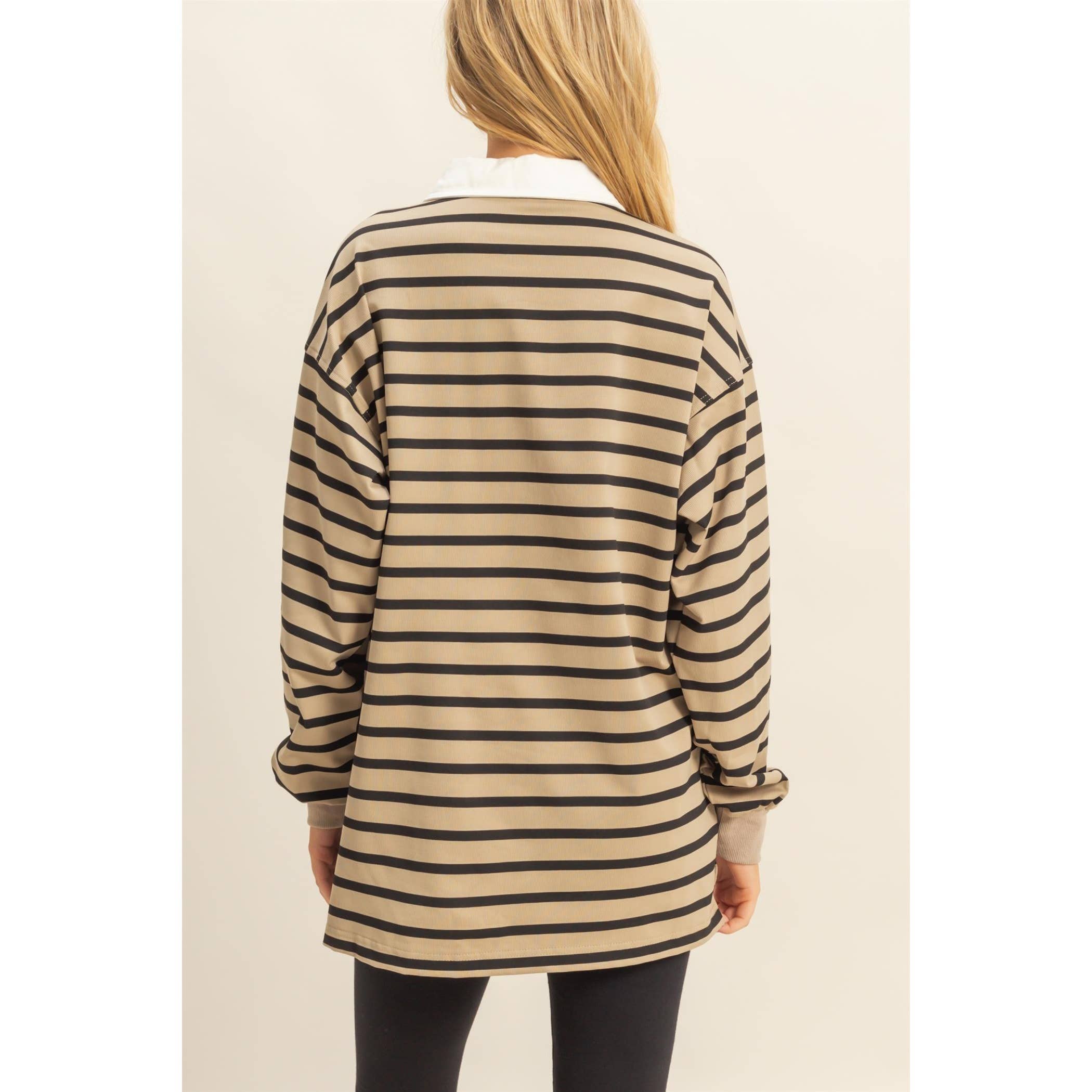 Refined and timeless, this classic stripe rugby polo features bold horizontal stripes contrasted by a sharply tailored collar. Crafted in elegant taupe and black tones, it offers a polished look that effortlessly transitions from casual to smart settings.